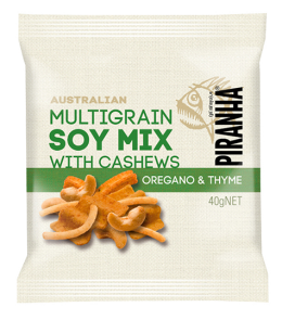Multigrain Soy Mix with Cashews – Oregano & Thyme 40g No Artificial Flavours Cooked in Sunflower Oil No Artificial Colours Source of Dietary Fibre No Preservatives 100% Australian Owned No Added MSG Halal Ingredients Cashews[30%], Wheat Starch, Sunflower Oil, Soy flour[14%], Sugar Multigrain Meal[3%] (Corn, Wheat, Barley, Rice, Oats, Rye), Sea Salt, Vegetable Powders (Garlic, Onion, Celery), Yeast Extract, Barley Malt Extract, Soy Sauce Powder(from Soy, Wheat), Natural Flavours, Herbs (Parsley, Oregano[0.1%], Thyme[0.1%]), Chive Flakes, Sesame Seeds, Spices (Turmeric, Paprika). Contains: Gluten, Cashews, Soy And Sesame May Contain: Peanuts, Other Tree Nuts And Milk From Processing Lines. Nutrition Information Servings per pack: 1 Serving Size: 40g Average Quantity Per Serving Average Quantity Per 100g Energy 884 kJ (211 Cal) 2210 kJ (529 Cal) Protein 3.2 g 7.9 g Fat, total 13.3 g 33.3 g – saturated 1.7 g 4.3 g – trans less than 0.1 g less than 0.1 g – polyunsaturated 2.0 g 5.0 g – monounsaturated 9.6 g 23.9 g Cholesterol 0 mg 0 mg Carbohydrate, total 18.3 g 45.7 g – sugars 2.6 g 6.5 g Dietary Fibre 3.3 g 8.3 g Sodium 236 mg 590 mg Piranha Soy Snacks are made from the finest ingredients and are cooked in sunflower oil. Note: Above figures have been calculated from analytical reports and data obtained from suppliers. 100g 100g 200g 40g 100g